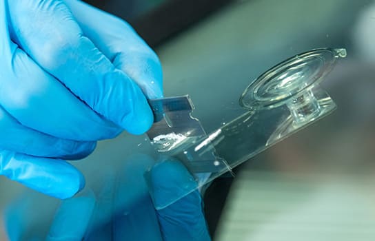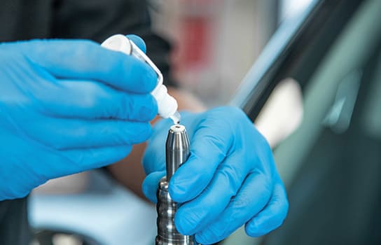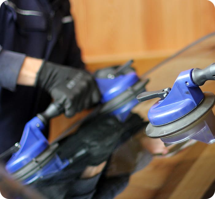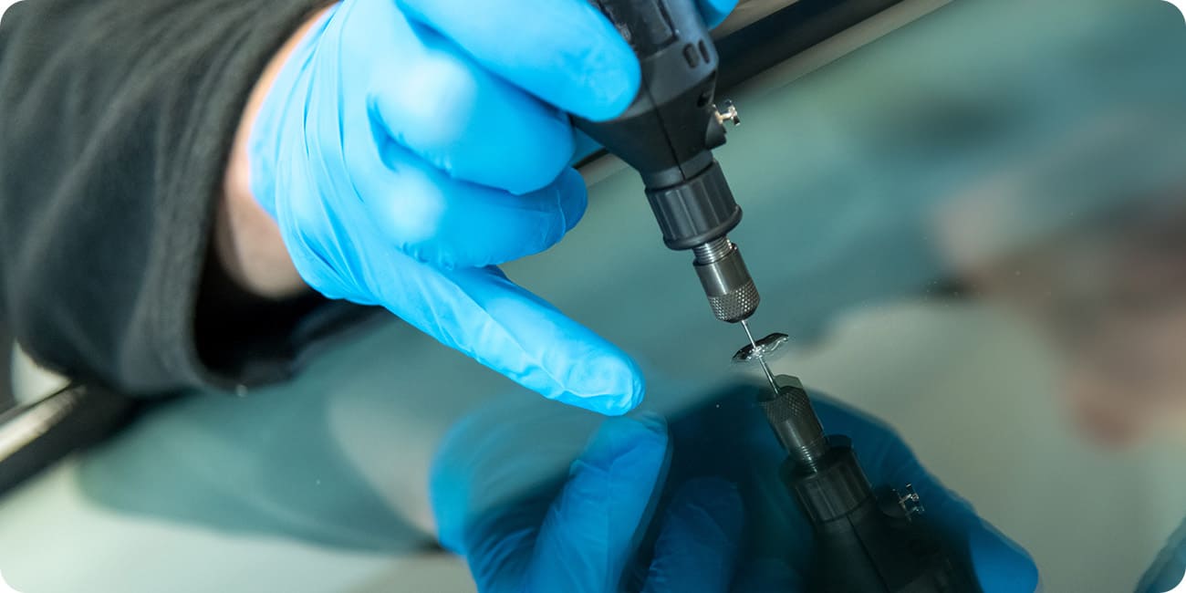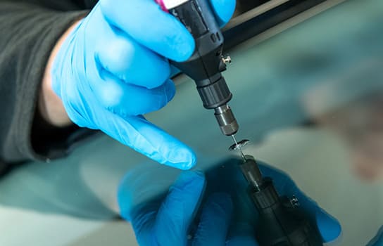 フロントガラスには2枚のガラスの間に特殊樹脂フィルムが挟まれた合わせガラスが使用されています。表側のガラスに深い傷がつくと、空気が入り込み、傷が大きくなりひび割れを引き起こします。専門業者は専用機器を使って空気を抜き取り、ガラスリペア剤を注入し、紫外線で固めて補修します。